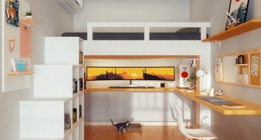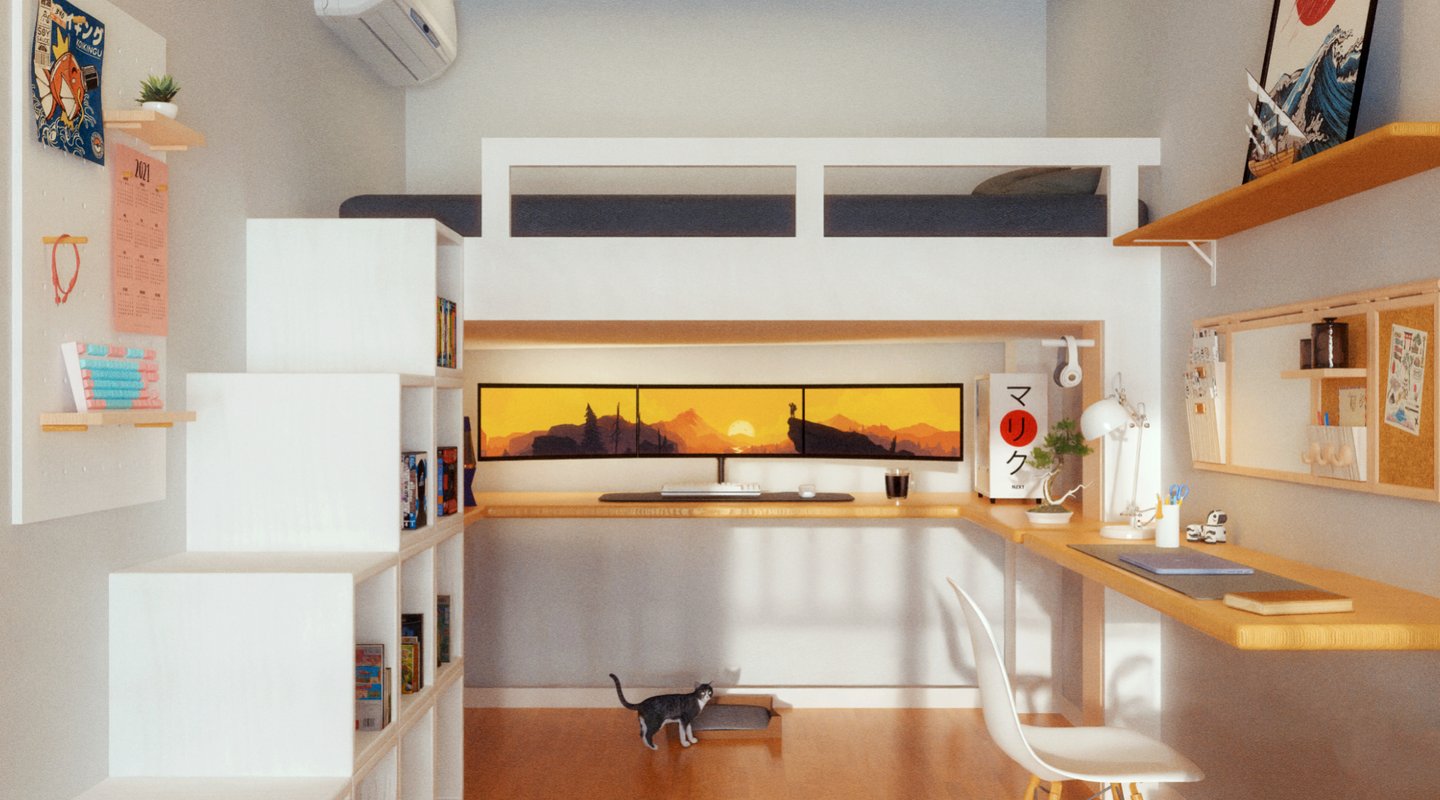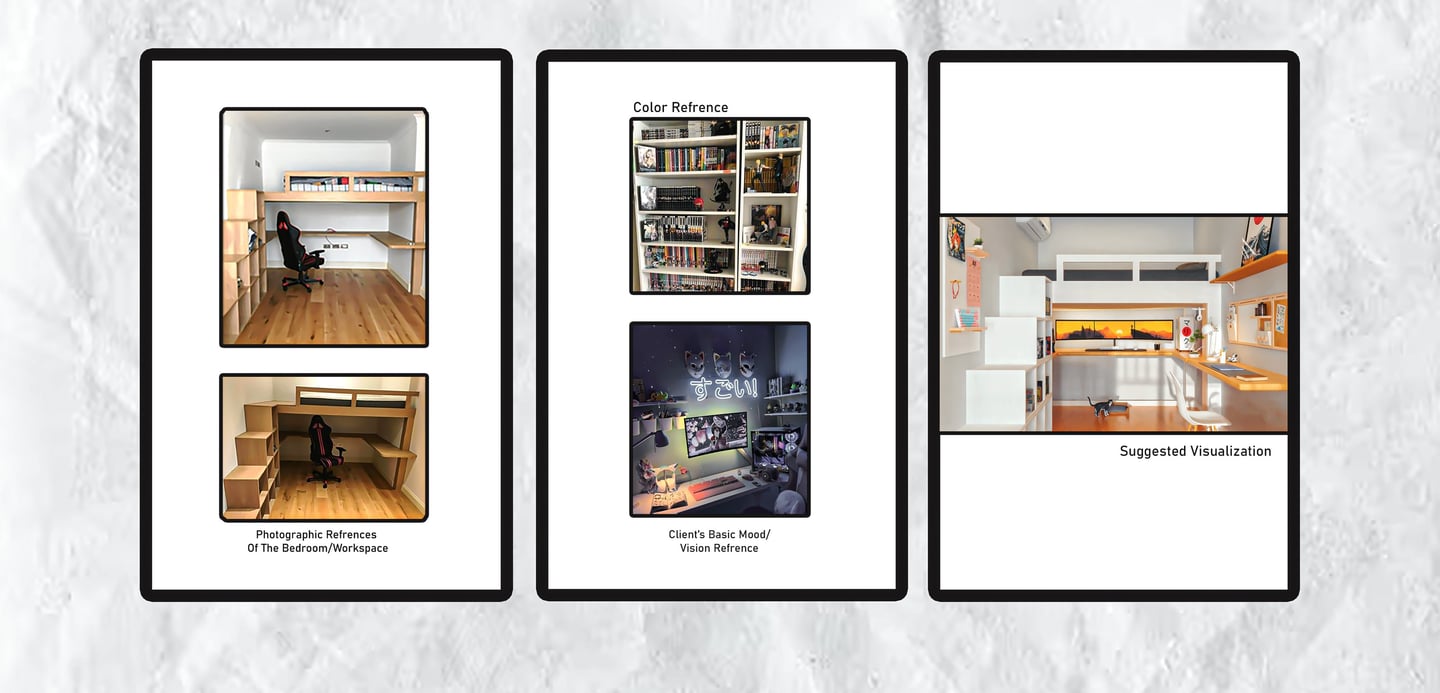 This digital concept was created for Malik, a graphic designer from England. The goal: transform his cluttered bedroom into a focused, calming workspace designed around functionality and intentional design choices.